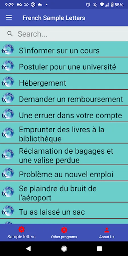 This app gives you more than 50 sample letters in French to help you learn how to write and to use these samples as templates for your everyday needs for writing letters.