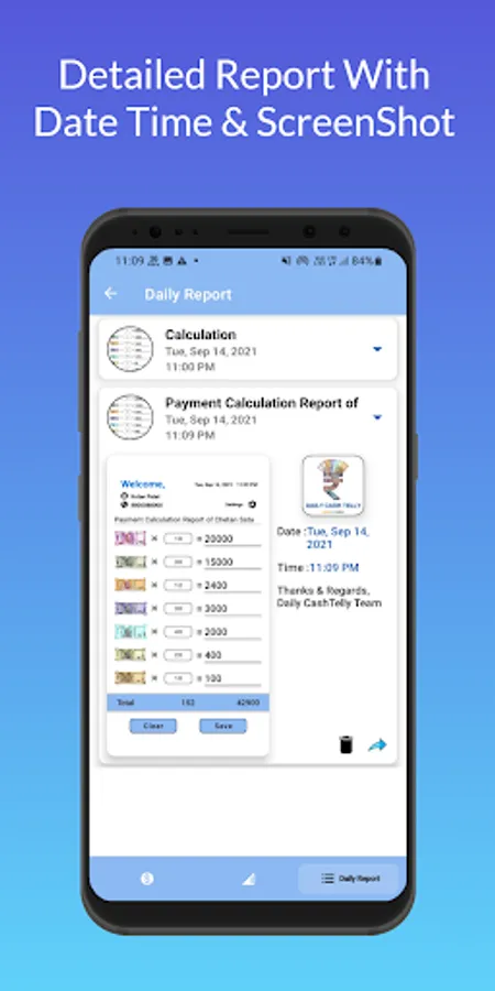 Using this daily cash app you can easily tally your cash in half time and save time calculator .Just put the number of notes of each denomination to get the total cash with individual