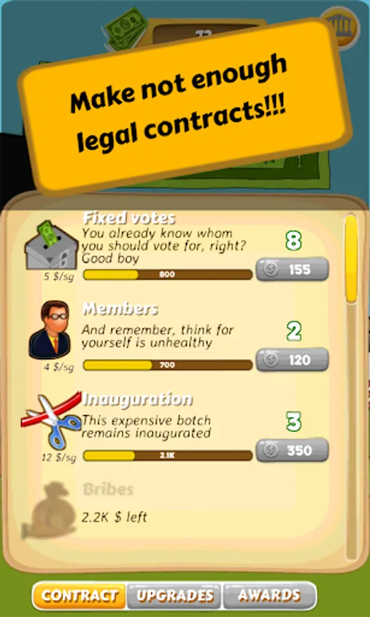 Make contracts like: Fixed votes, Botchs inaugurations, Black credit cards, Illegal constructions, Stock market speculation, Tax increases and more...