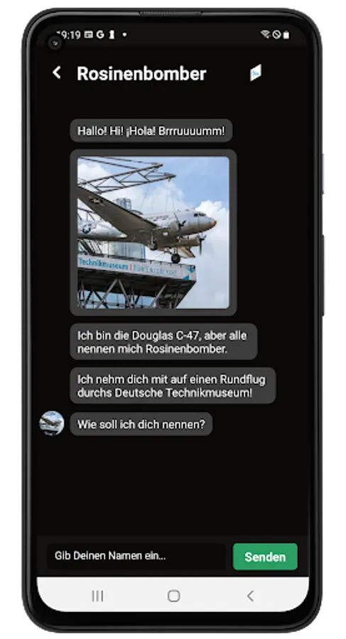 Meet your object in the German Museum of Technology! The museum app "My Object - Deutsches Technikmuseum" brings you into conversation with the exhibits in the museum. Choose objects based on your preferences and interests and chat with them. Look forward to exciting conversations with over-motivated sailing ships, relaxed locomotives and musical gramophones. The course of the conversation is entirely in your hands. Can you find your perfect match?