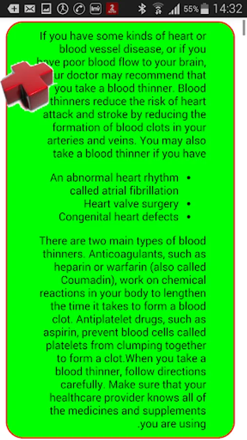 The application is designed to give your health information when necessary. If you're on the street, and you should not have any information to those around you, this app will give all the information and save your life!