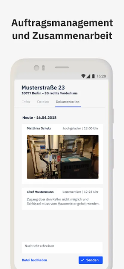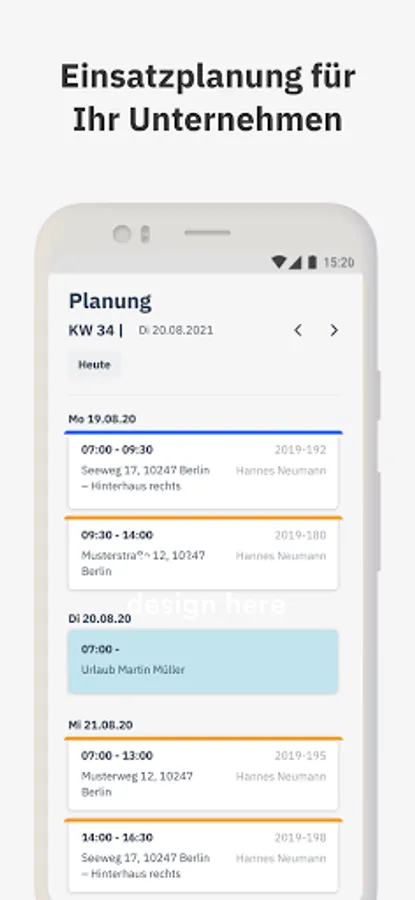 The most important functions in the app are the calendar and the information center. The clear calendar helps tradespeople to organize appointments and orders in the best possible way and to optimally utilize employees as well as vehicles and machines. All documents are stored in digital form in the app and customer information is linked to the order. Planners and foremen keep track of the progress of the orders.