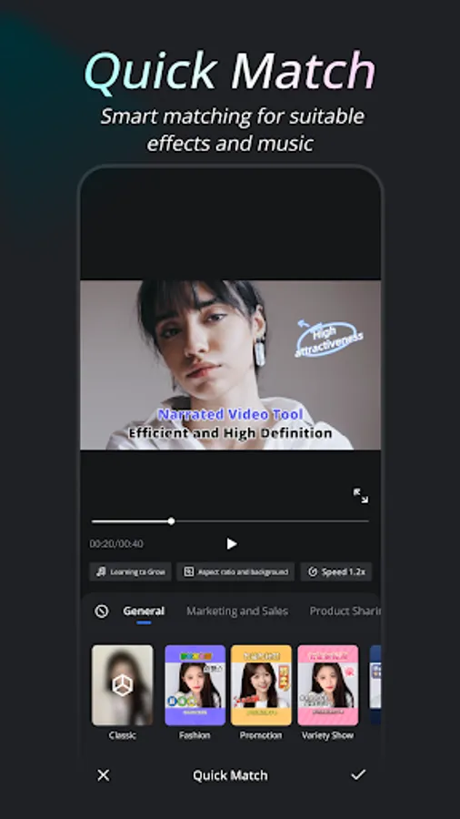 Quick Match: A smart feature that efficiently identifies keywords and matches them with subtitle markers, stickers, music, and special effects. This enhances the overall atmosphere of the video and improves editing efficiency. It supports various other functionalities such as adjusting video speed, fine-tuning filter colors, enhancing voice quality, and sound cloning. There are also a wide range of templates for seamless video editing, making tasks like sharing products and marketing sales much simpler.