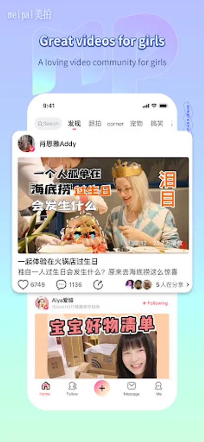 We've prepared lots of topics for our female users so you can easily find friends who have similar tastes and interests on Meipai, including shopping experiences, delicious food, marital isssues, career advice, TV shows, pets, and more!
