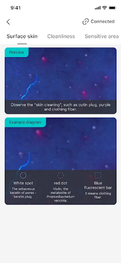 - Real-time detection of skin conditions using three spectrums, revealing even the slightest details of pigmentation and underlying melanin.