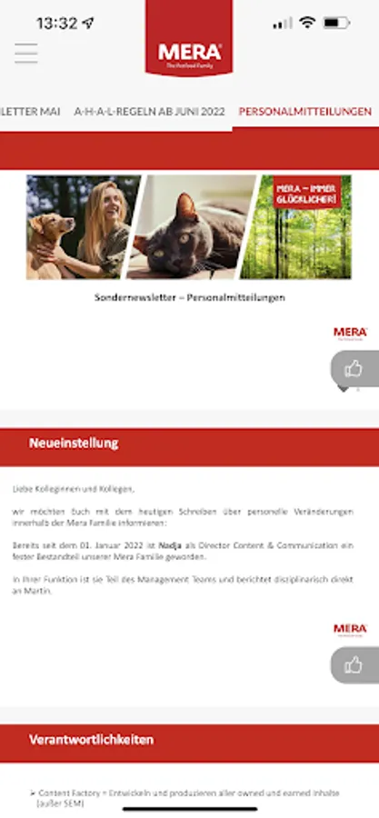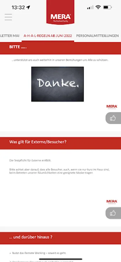 The MERA employee app is used for timely communication and better transparency at MERA: It informs employees about current events in the company and in our industry, reminds them of important dates and enables an open, interactive exchange between colleagues and management.