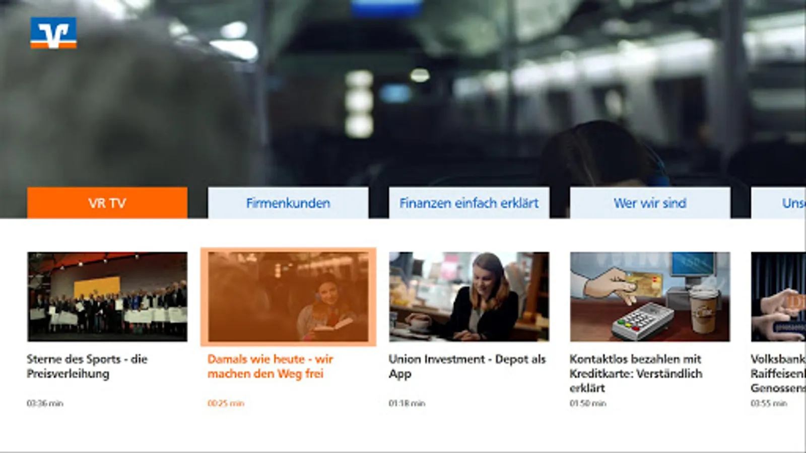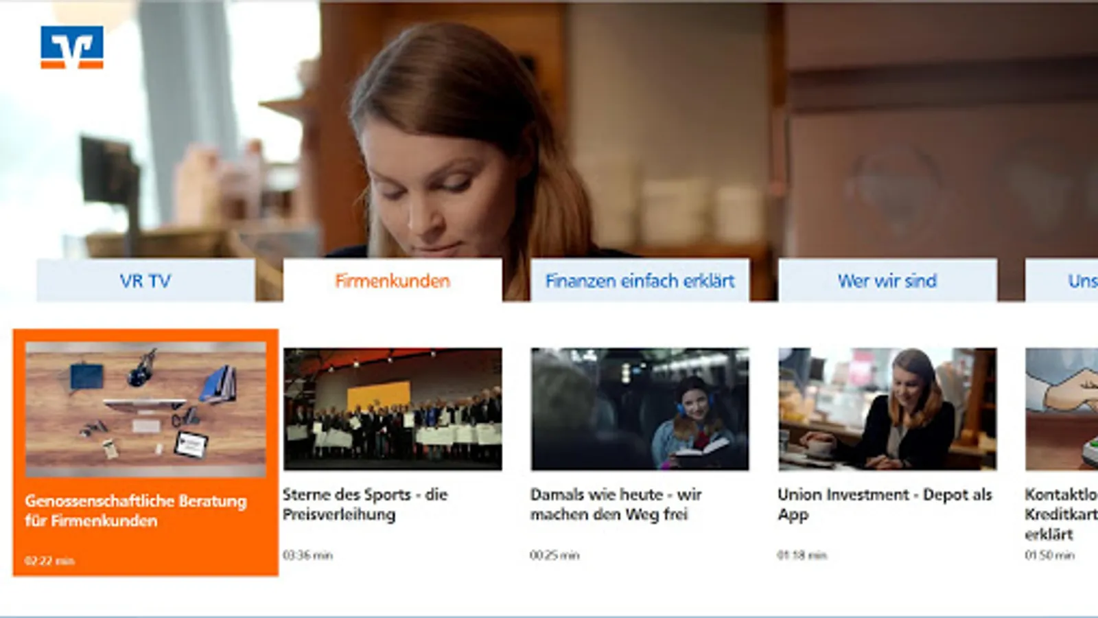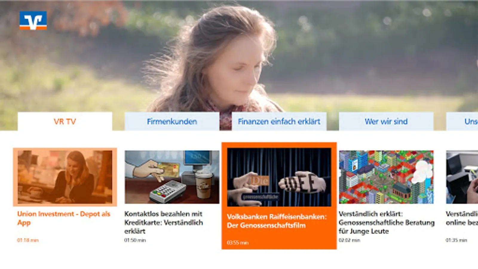 The "VR SmartTV" app is a streaming platform for video content of the local cooperative banks. The viewer has access to rich content around services and counseling services of his local bank. A selection of topics: Social responsibility and sponsoring, easy to explain financial issues, the Bank as an attractive employer, products and Quotes on private and corporate customers.