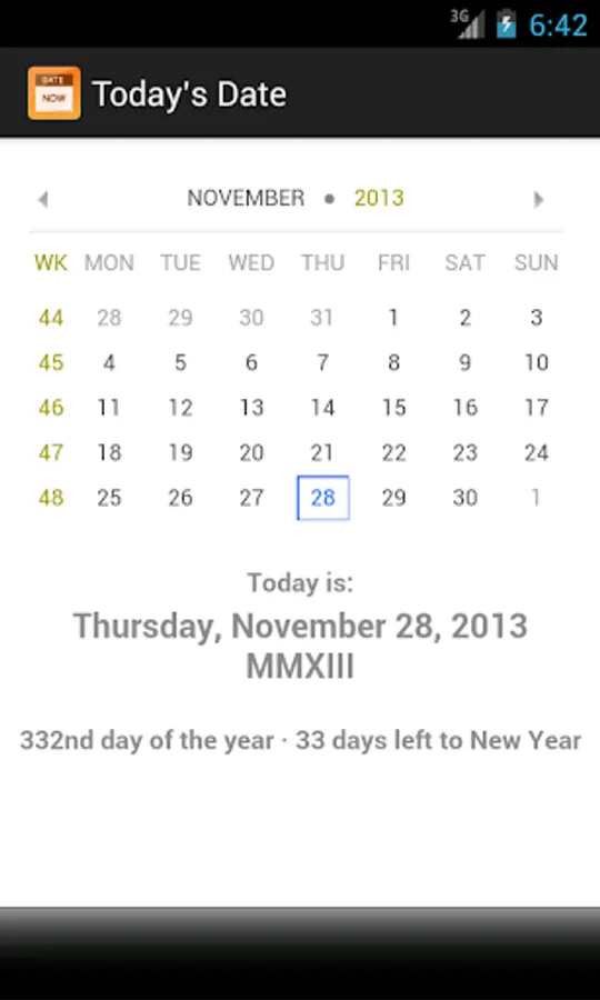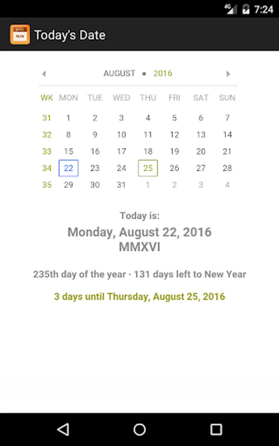 Simple app that will show you today's date, the current week, day of the week, the roman year, the day of the year and how many days left to new year.