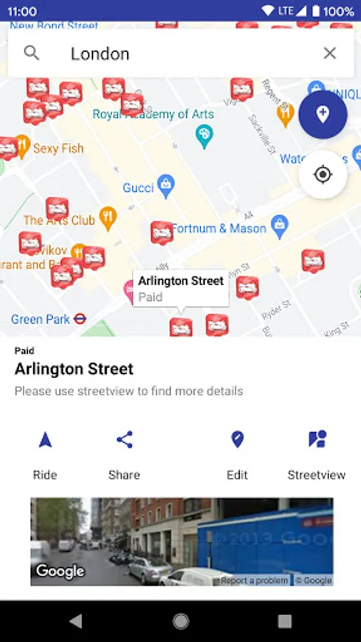 The parking locations will be displayed on the map with a street view option where available.