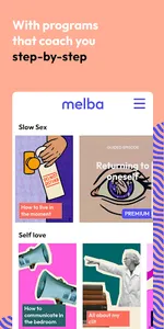 Our research-based programs will coach you step-by-step. Within minutes, you can master a new skill to spice up the bedroom, live out your fantasies, and re-discover yourself and your partner with Melba.