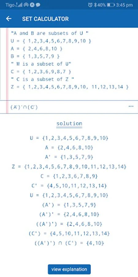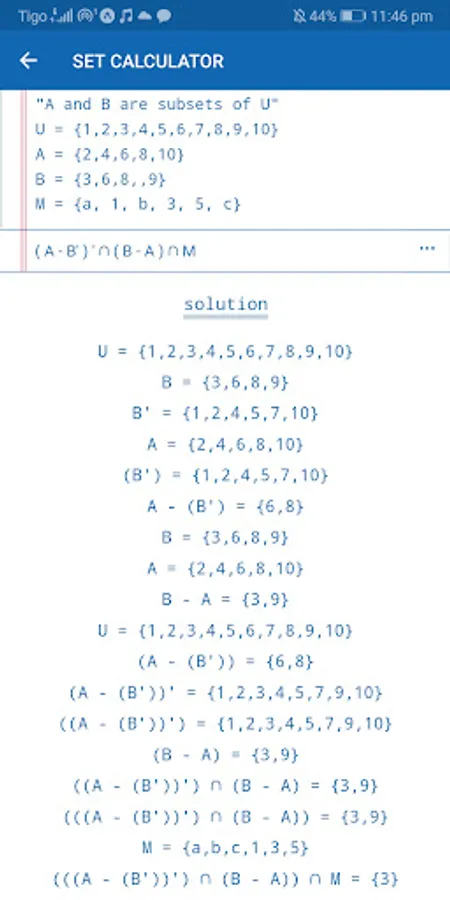 A Set Calculator designed to assist you in performing set operations by giving you step by step solutions and explanations on how to carry out the operation. It also contains comprehensive notes that will give you a good foundation in set theory. The note covers set notations, subsets, set of number systems, set operations.....