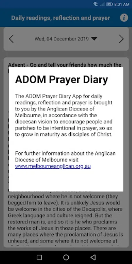 The ADOM Prayer Diary App for daily readings, reflection and prayer are brought to you by the Anglican Diocese of Melbourne, in accordance with the diocesan vision to encourage people and parishes to be intentional in prayer, so as to grow in maturity as disciples of Christ.
