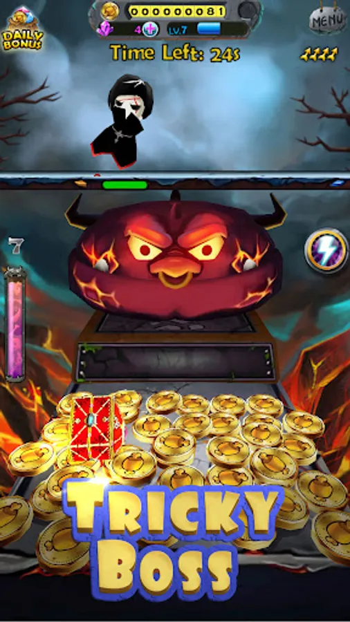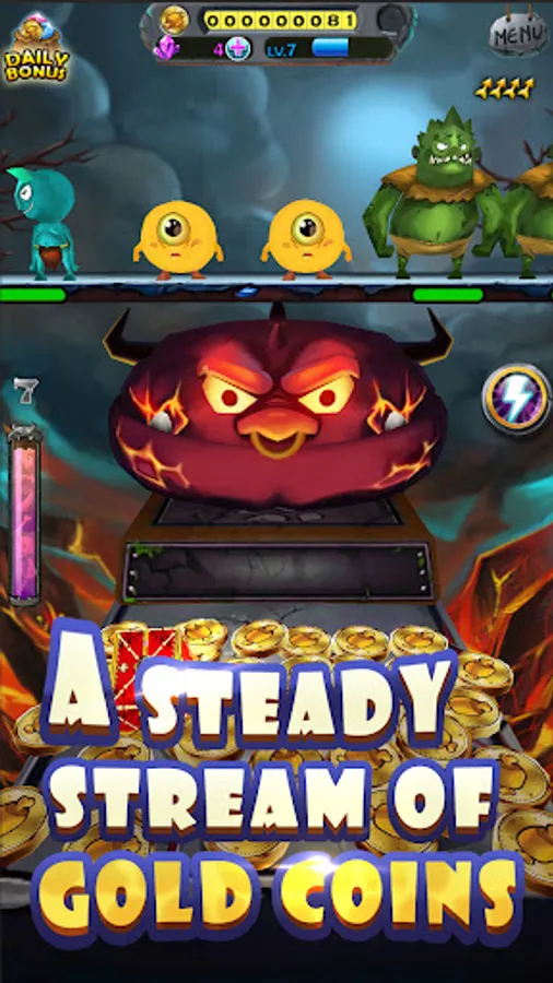 When each arrow hits the monster, you will get a chance, a gold coin that will soon belong to you. The gold coins will fall on the platform, try to drop the gold coins carefully so that they can push the other medals and prizes off of the edge.