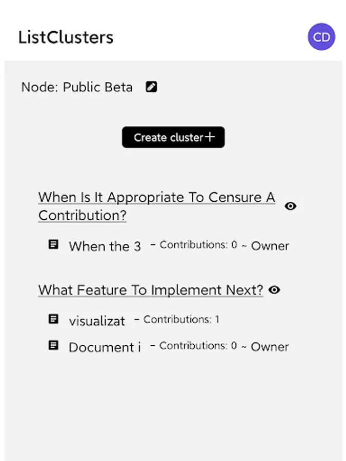 All information is structured as Perspectives around topic Clusters. Any Perspective could be Contributed to by highlighting any text to Inquire/Challenge/Edit, which is then Accepted/Rejected by the owner of the Perspective in question. Users could Vote to support one Perspective per Cluster, and to Bump specific Contributions.