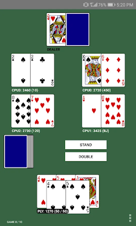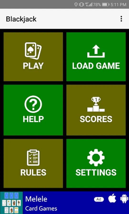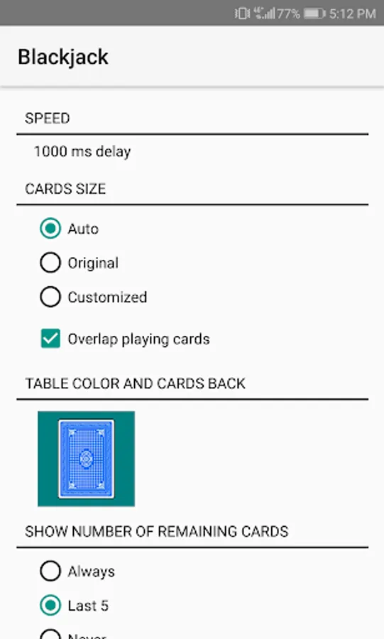 - Settings: Cards size, cards back color, sound, animations, speed, scoreboard, table and scores color...