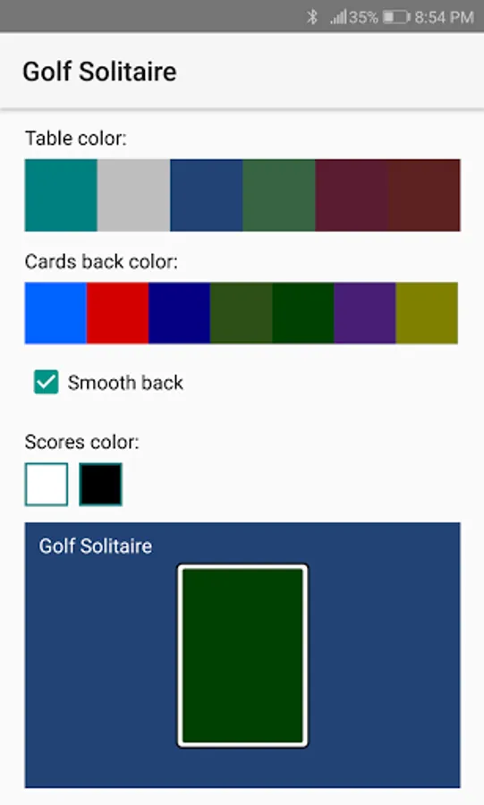 - Settings: Cards size, cards back color, sound, scoreboards, table and scores color,...