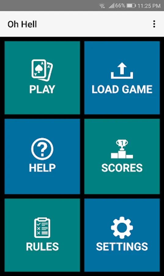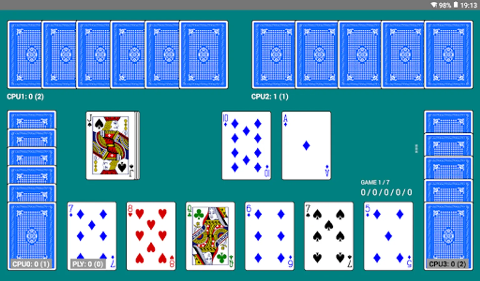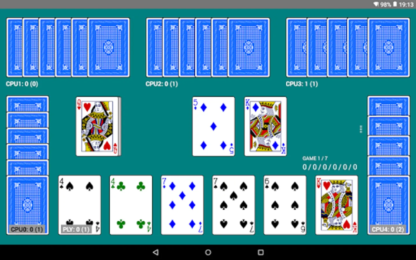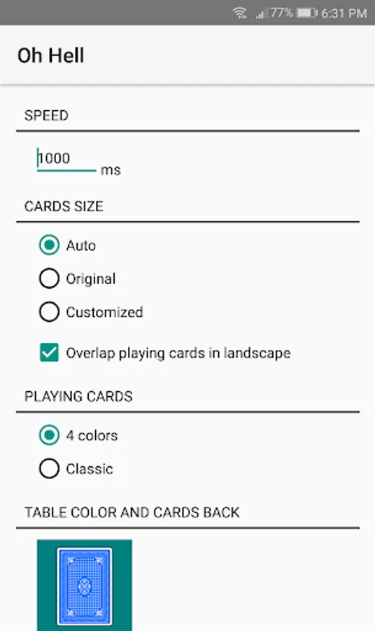 - Settings: Cards size, deck type (four-color or classic), cards back color, sound, animations, speed, scoreboard, table and scores color, see names on the table cards...