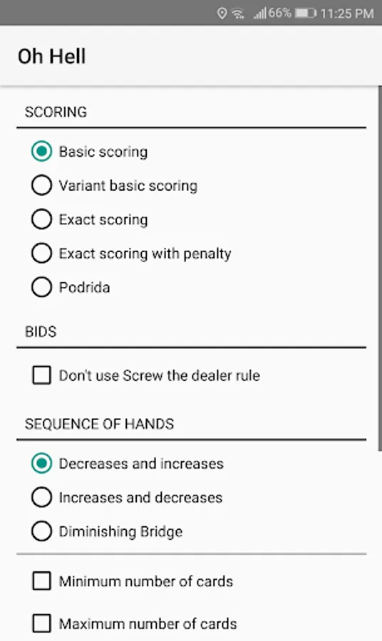 - Sequence of hands variants: (Decreases and increases, Increases and decreases, Diminishing Bridge), maximum and minimum number of cards