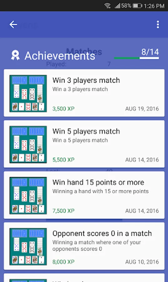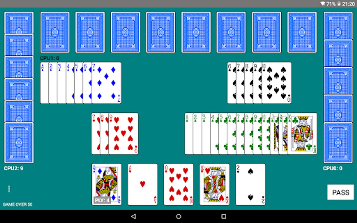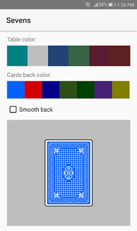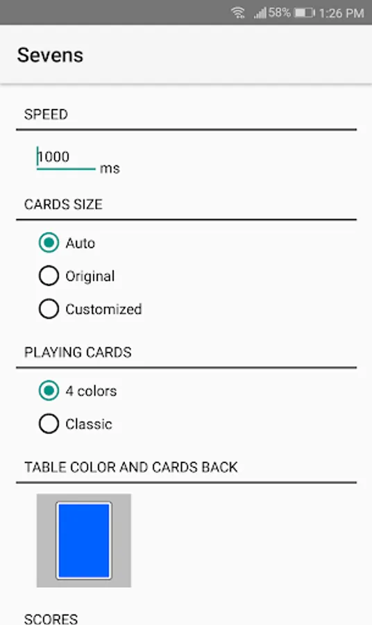 - Settings: Cards size, deck type (four-color or classic), cards back color, sound, animations, speed, scoreboard, table and scores color...