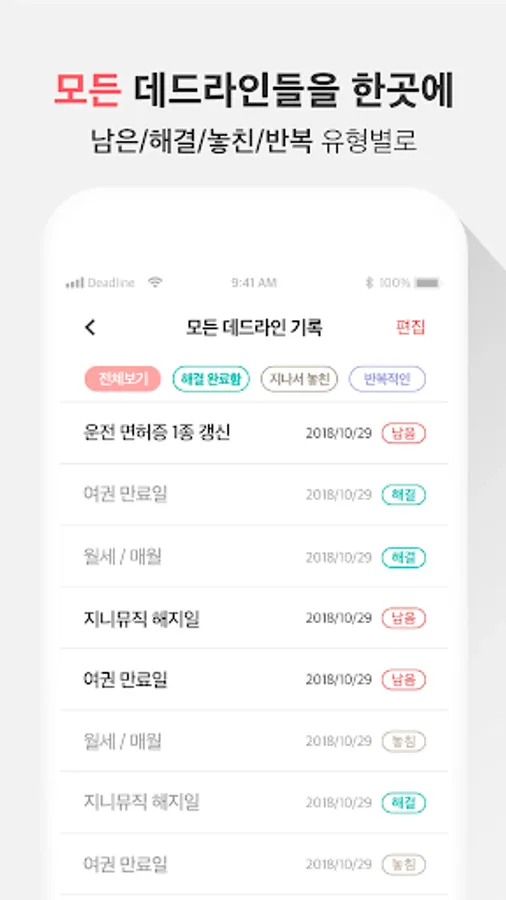 미팅, 발표, 서류/보고서 제출, 생일, 결혼기념일, 가족행사까지 데드라인 앱에서 관리하세요!