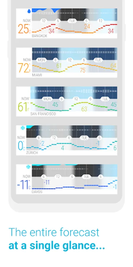 Get the whole picture: Temperature, precipitation, wind, and cloudiness are all shown in a compact, yet intuitive way.