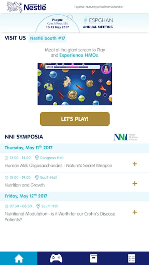 The Nestlé Congress App is designed for participants at the 50th ESPGHAN Annual Meeting, 10-13 May 2017, Prague, Czech Republic. The app allows participant to :