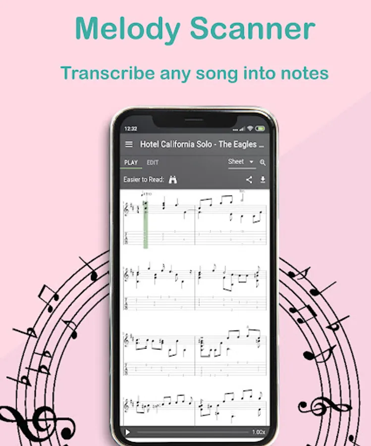 Transcribe music recordings from YouTube, MP3 or microphone to sheet music and edit them online.With the Melody Scanner App you can create on-the-go recordings of your instrument. Those are uploaded to your personal cloud songbook and transcribed to score.