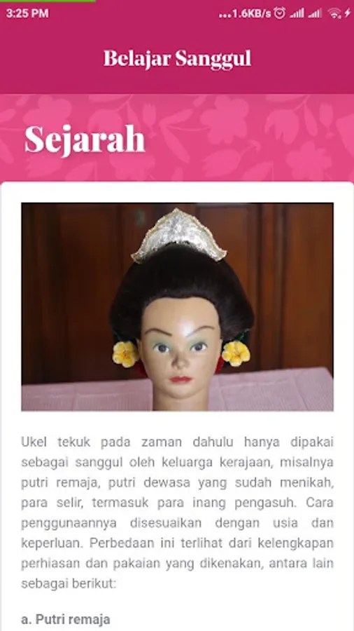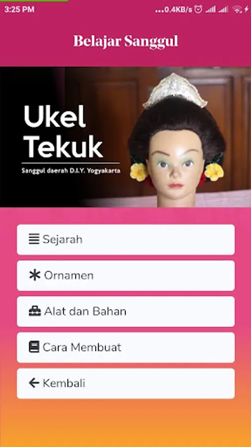 "Javanese bun" is an application that will help users to learn regional bun in the form of Javanese bun in Central Java and DIY in the form of bun Ukel Konde and Ukel Tekuk. In this application will be explained starting from the history of the bun, the characteristics of the two bun, tools and accessories used to the steps of making the bun Ukel Konde and bun Ukel Bend.