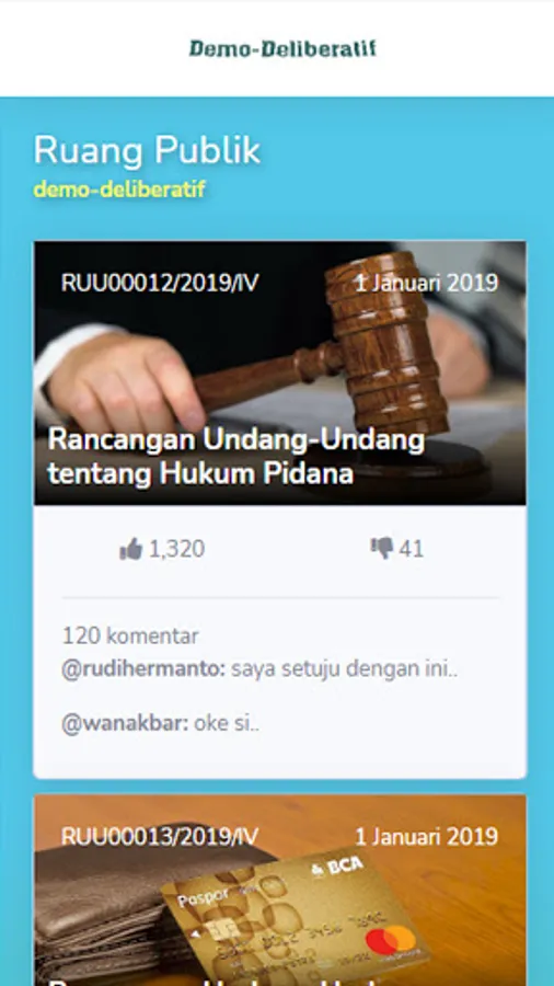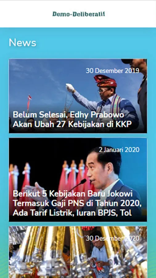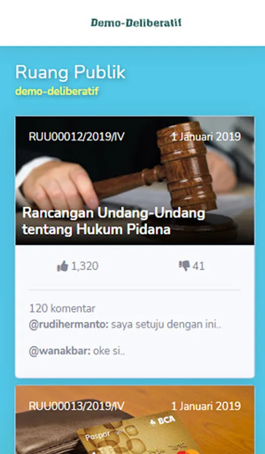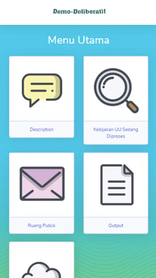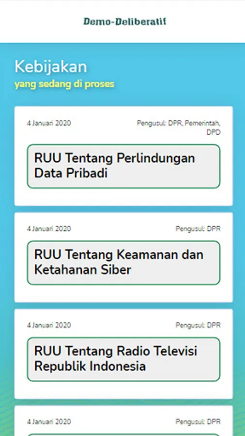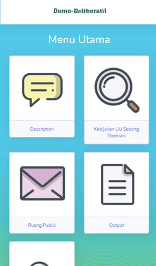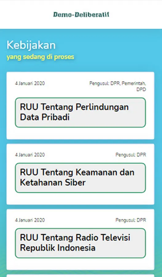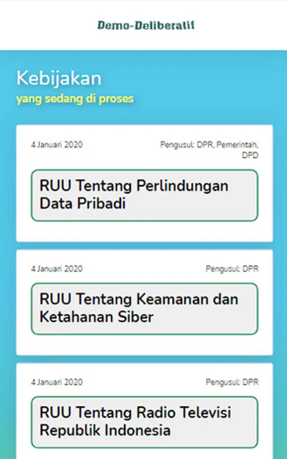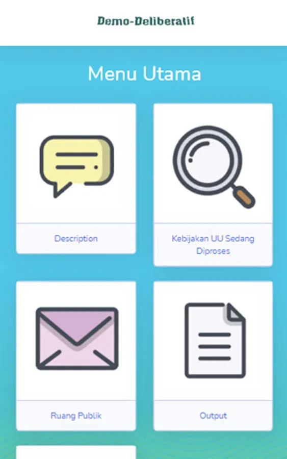Demo-deliberative is a platform in the form of an application with the aim of socializing politics through an understanding of democracy. In addition, it makes it easier for citizens to criticize public policies, even when the policy process is formed. After that the input received will be used as an output to improve the policy itself so that there is no controversial policy and in accordance with the wishes of the community.