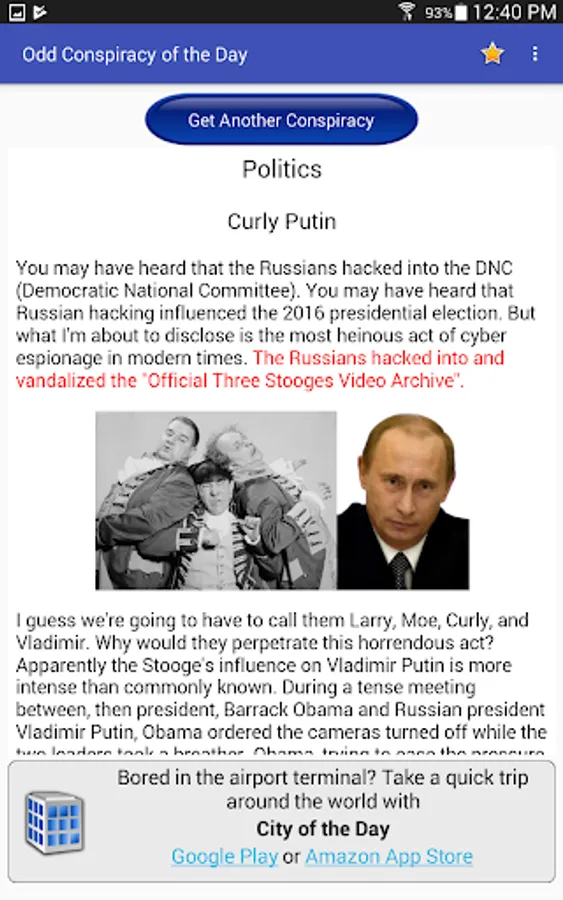In the mood for a completely ridiculous conspiracy theory? Grab a random post from http://OddConspiracyCentral.com. Politics, secret organizations, aliens, supernatural, they're all exposed here!!!