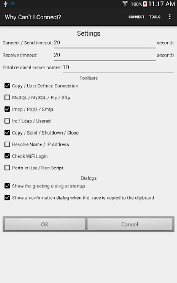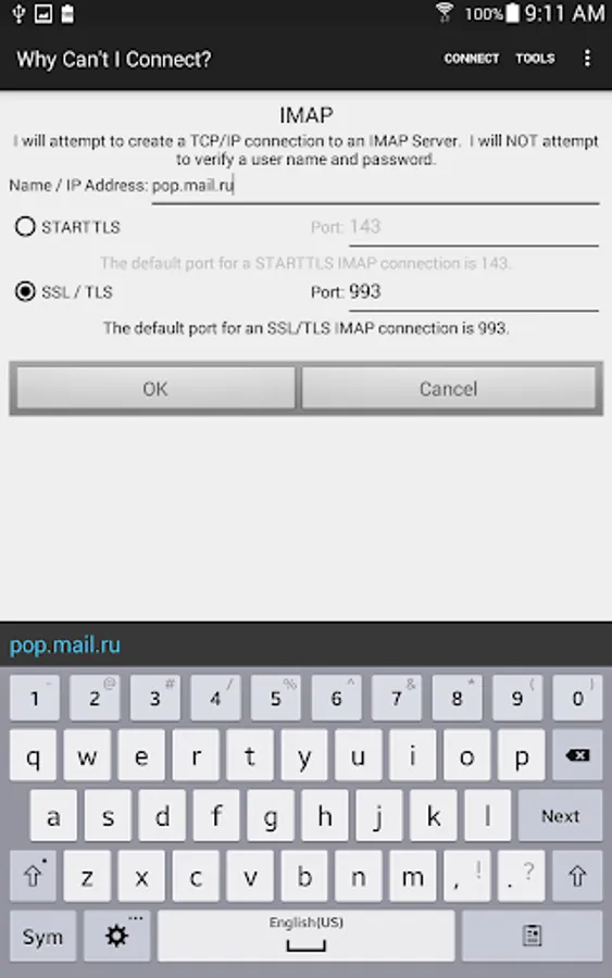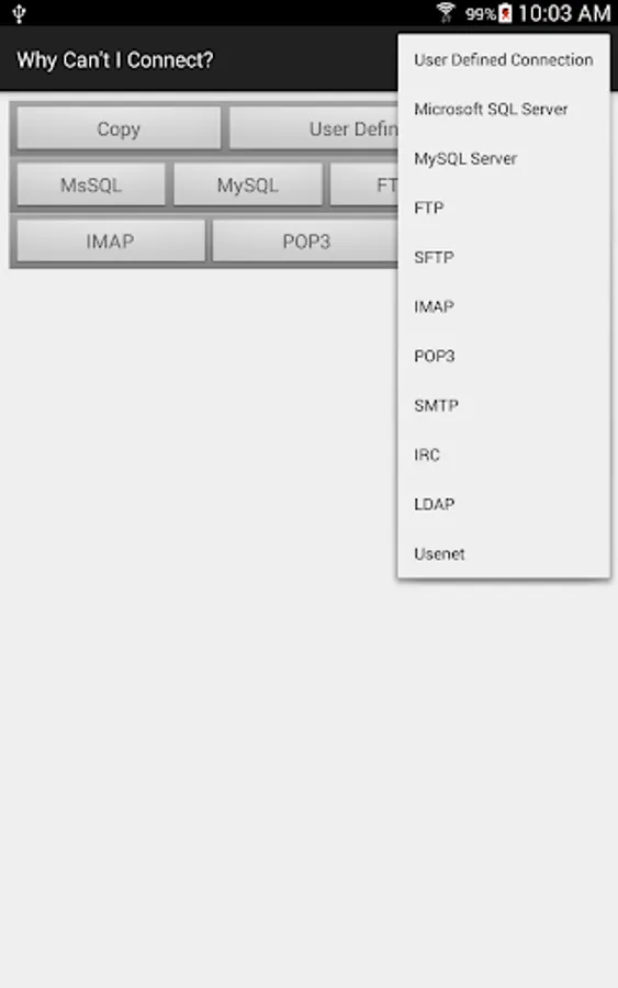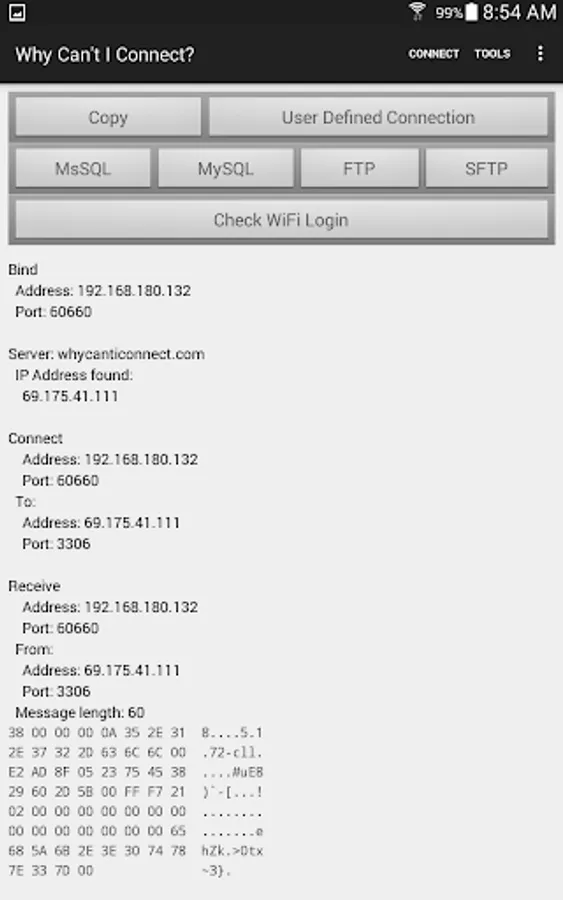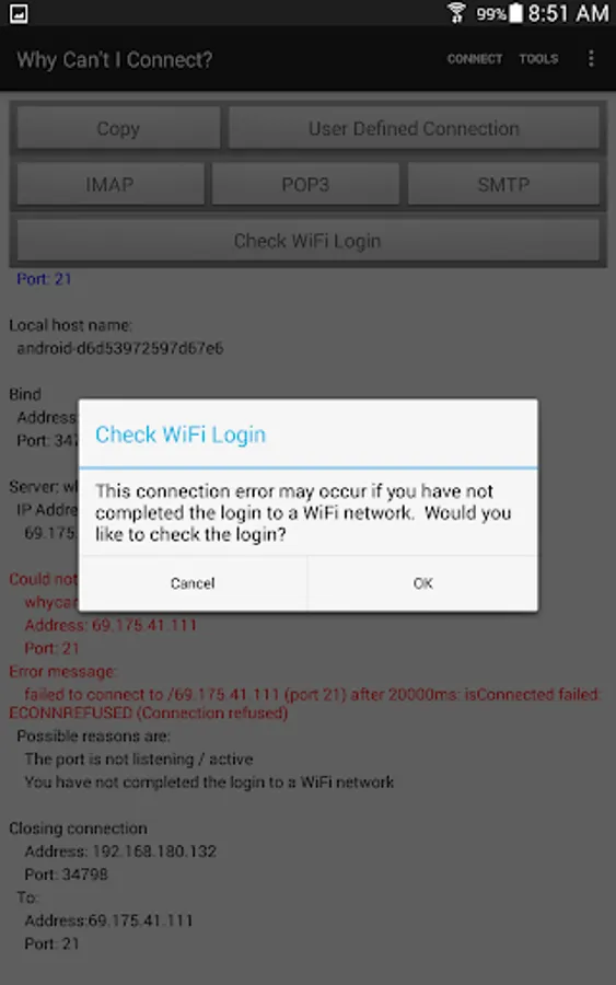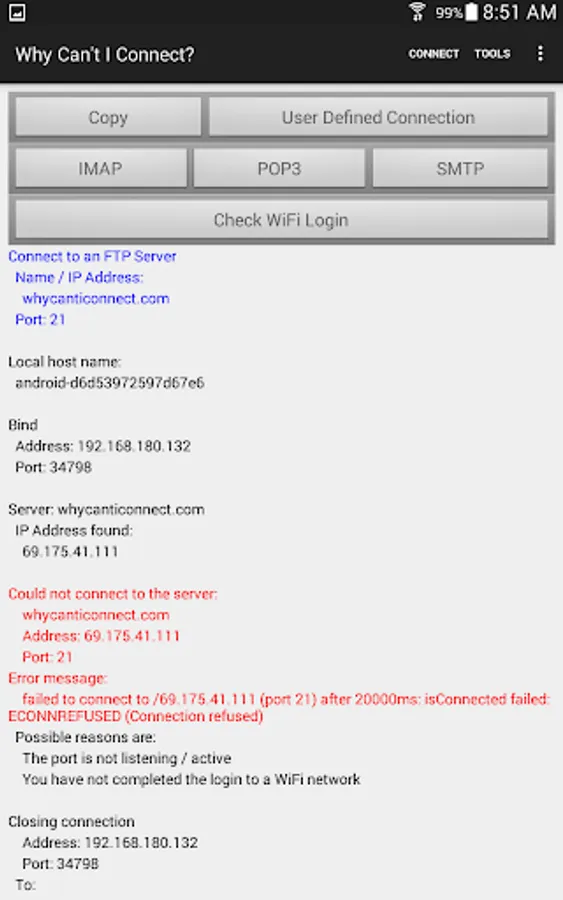 "Why Can't I Connect?" is a network diagnostic tool that makes it easier to resolve TCP/IP connection errors. Diagnose connections to common server types (Microsoft SQL Server, MySQL Server, FTP, SFTP, IMAP, POP3, SMTP, IRC, LDAP, and Usenet) or create a user defined connection on any port. Maybe a firewall is blocking the requested port, the port isn't listening, DNS isn't returning the expected address, DHCP hasn't supplied a local IP address, the WiFi login isn't complete... The app will step through the connection process, resolving all IP addresses, displaying all sent and received messages in both hexadecimal and ascii. Any errors will be reported with possible causes for the error. Are you unsure of which ports are being used on your device? The "Ports In Use" function will show all the connected ports, listening ports, or ports that can not bind for any reason. Prerecorded scripts may be run to test multiple connections. The scripts may be recorded using the "Why Can't I Connect?" PC application. There are prerecorded scripts available from the Melon Realized web site https://www.whycanticonnect.com/?q=downloads . These scripts contain test connections for many common email servers (Free.fr, Gmail, GMX, Interia.pl, Lycos, Mail.ru, Outlook, Web.de, Yandex, Yahoo, and Zoho.) Use the "Resolve Name / IP Address Function" to resolve a domain name to an IP address or an IP address to a domain name. "Why Can't I Connect?" is a DIAGNOSTIC TOOL ONLY. It will find the root cause of the error but it will not, apart from incomplete WiFi logins, attempt to repair the connection. The app is intended for users with some network experience or users who wish to be able to supply technical details to a help desk.