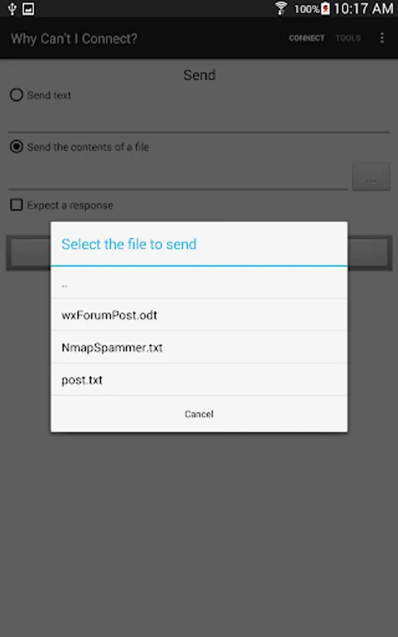 * User defined connections remain open. You are free to send text or the contents of a file. The connection remains open for sending and receiving until you shutdown or close, the connection peer closes the connection, or the operating system closes the app or connection.