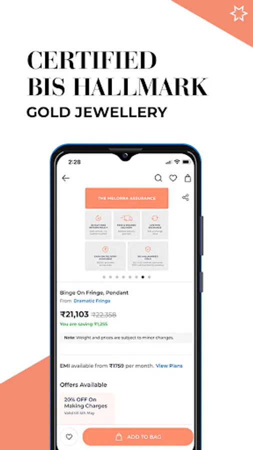 • All jewellery designs in the Melorra app are 100% exclusive designs and are 3D printed across India’s leading and technically advanced jewellery manufacturers. These are certified by independent and respected certification agencies like IGI, SGL and BIS.