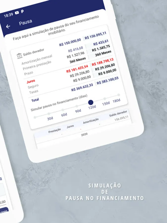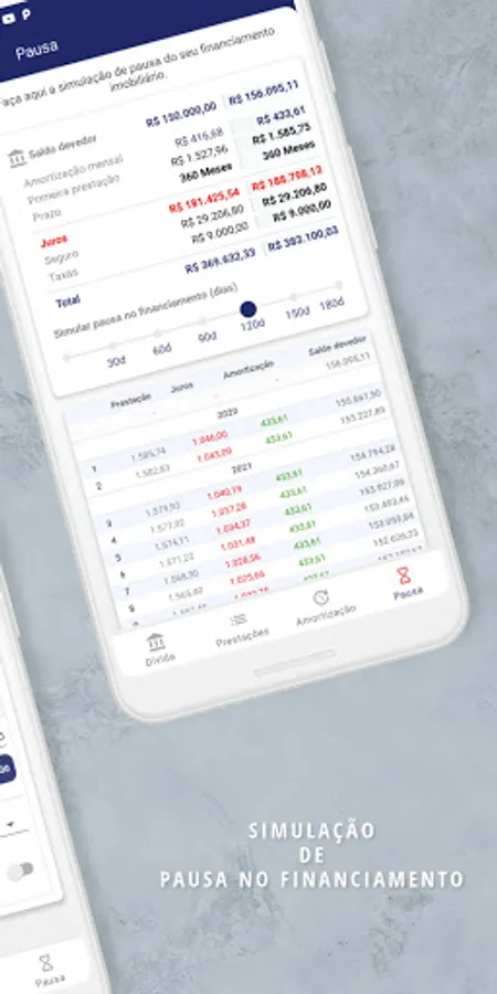 Calculate a break of 30, 60, 90 or 120 days in your financing and know what will be the impact on your outstanding balance, and how much will be the increase in each of your installments.