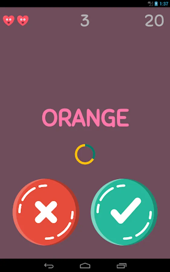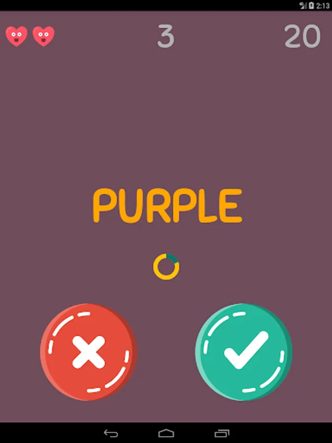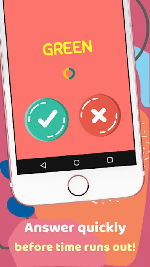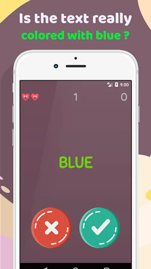 In this game you have to guess whether the color is correct or not. For example when you see text "RED" and it's colored with RED color then it's Right and you should press the Tick✅ button. But when you see text "WHITE" and it's colored with BLACK color then it's WRONG, so you should press the X❌ button. Don't let your eyes fool you. Think with your brain.
