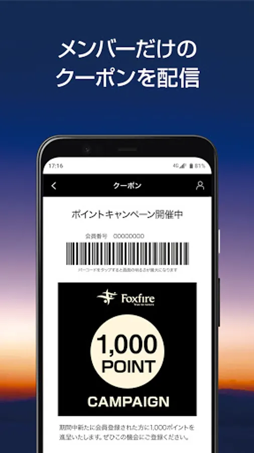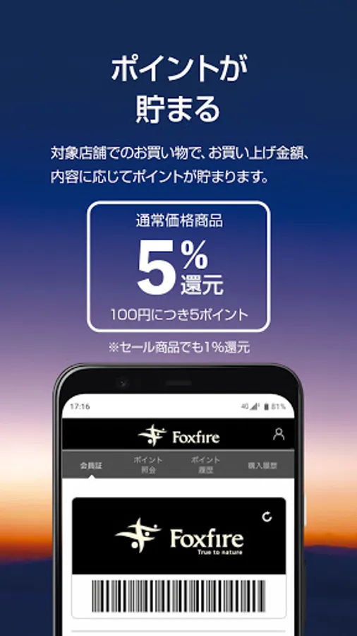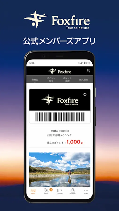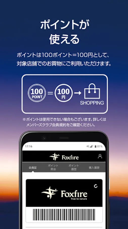 「Foxfire」アプリは、対象店舗でのお買い物でポイントが貯まるメンバーズカードとしてご利用いただけるだけでなく、最新のお知らせや、お得なクーポンなどが配信されるアプリです。