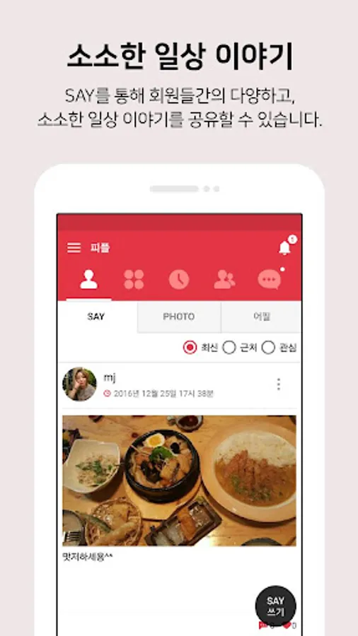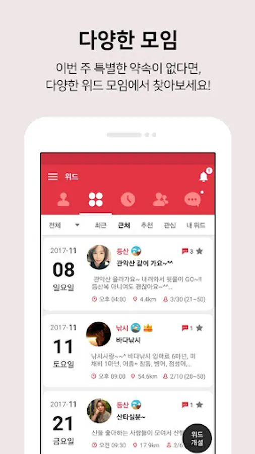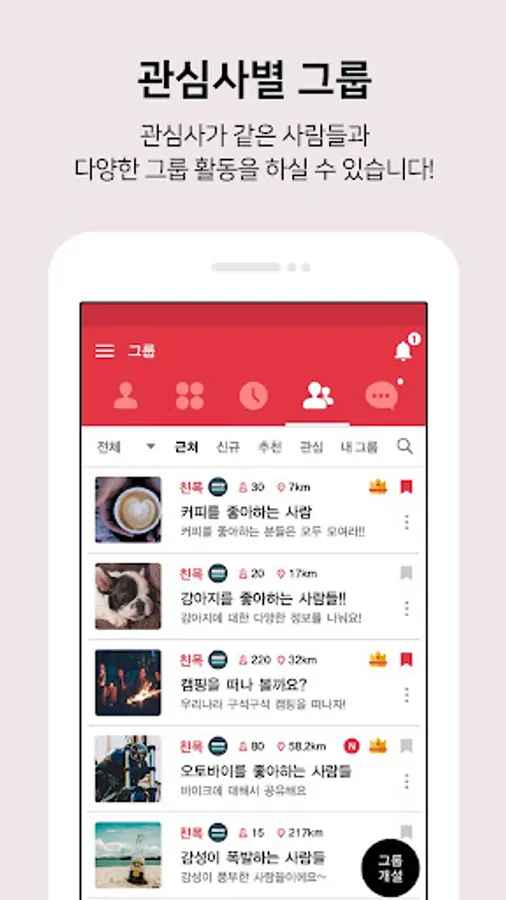 마음에 맞는 사람들과의 관심사별 활동이 가능합니다. 근처 사람들과 정기적인 동호회, 소모임을 갖고, 활발한 소통이 가능합니다.