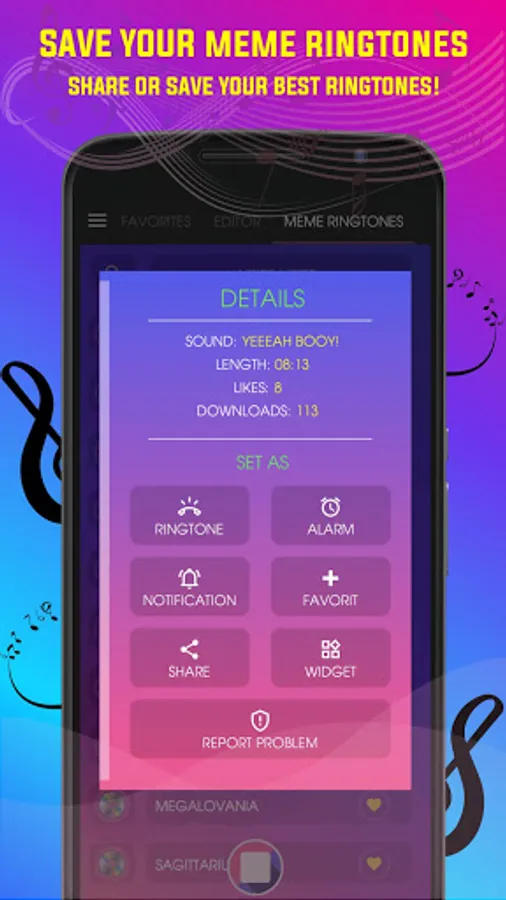 Furthermore, our ringtones application contains a Meme Soundboard and a powerful and simple sound meme editor that allows you to quickly create new ringtones for your notifications and to share free music tones with your friends. You can configure them as message tones, meme alarm sounds, notifications or ringtones for watsapp whenever you need it.