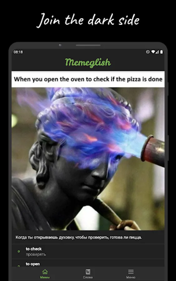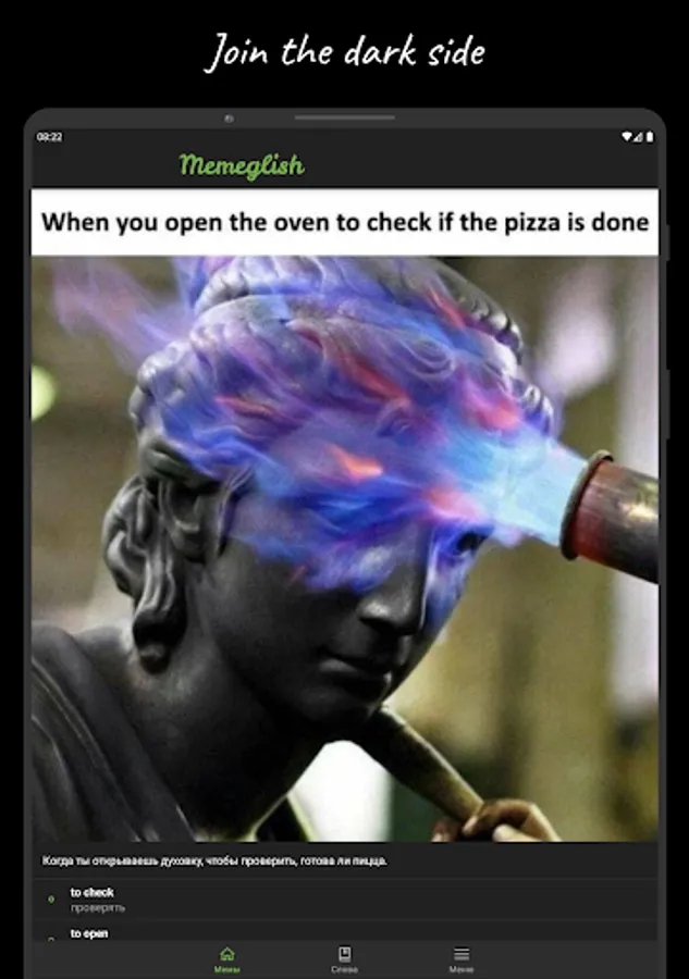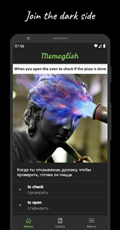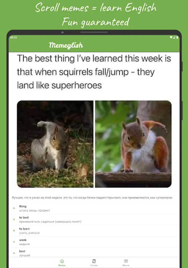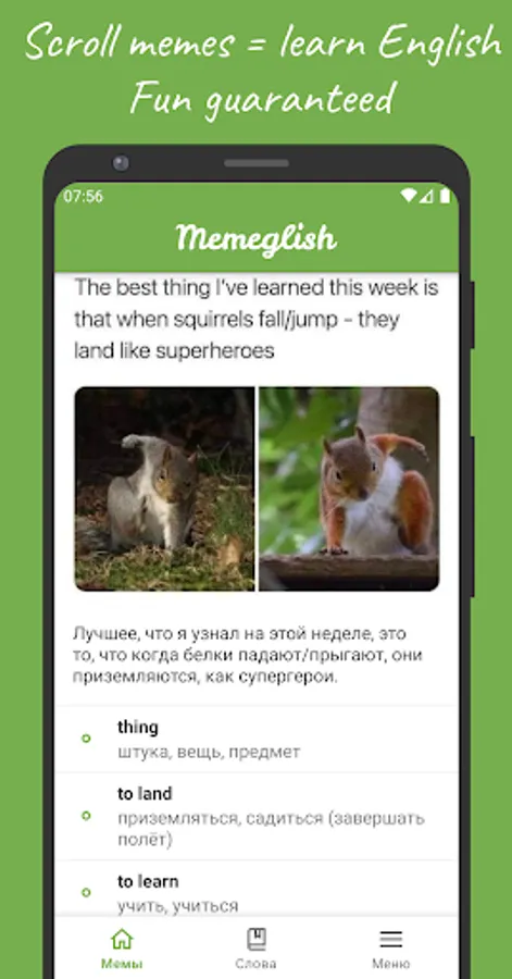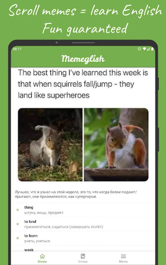 These days everybody needs some command of English. But no one likes to be bored! So we created Memeglish for those who are tired of the usual boring textbook experience. Scroll through the meme feed with dozens and even hundreds of those fresh memes in English, check translations and absorb words and grammar effortlessly.