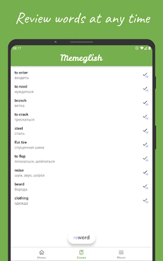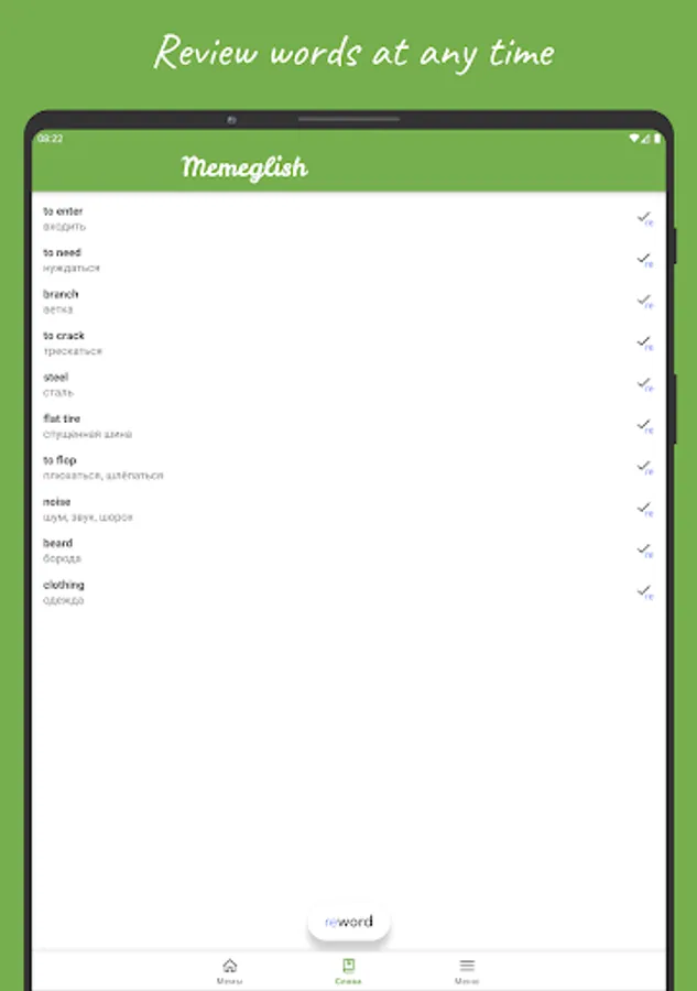 • Efficient training for new English words - just 'mark' the unknown word - and it goes to the "Words" tab and can be revised at any time.