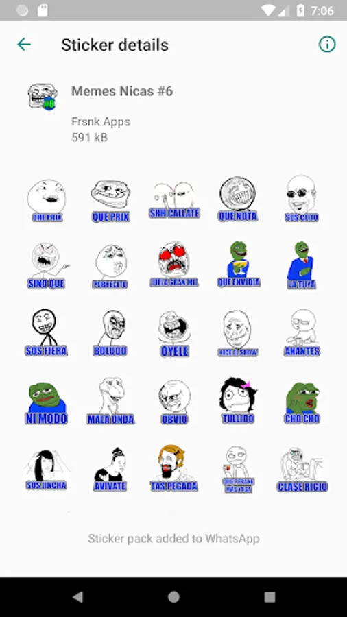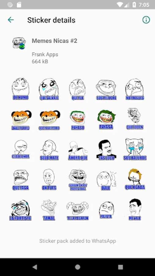 In this application it contains 210 stickers in total, divided into 7 packs of 30 memes stickers with unique phrases such as: tuani, ideay, que onda, maje, de humo, sallado, loquera class, desturque class, diakachimba, puchica, balurde , bacchanal, wild, humalera, diacachimba, jincho, choco, among others.