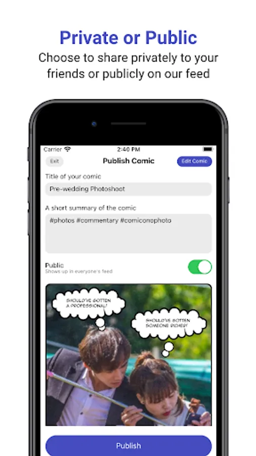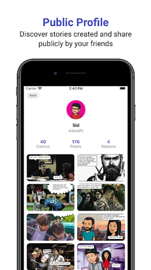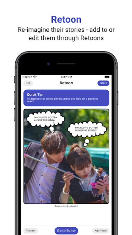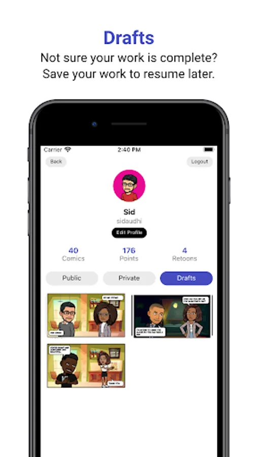 * Take turns on adding to an existing comic with friends. See what you can build together.