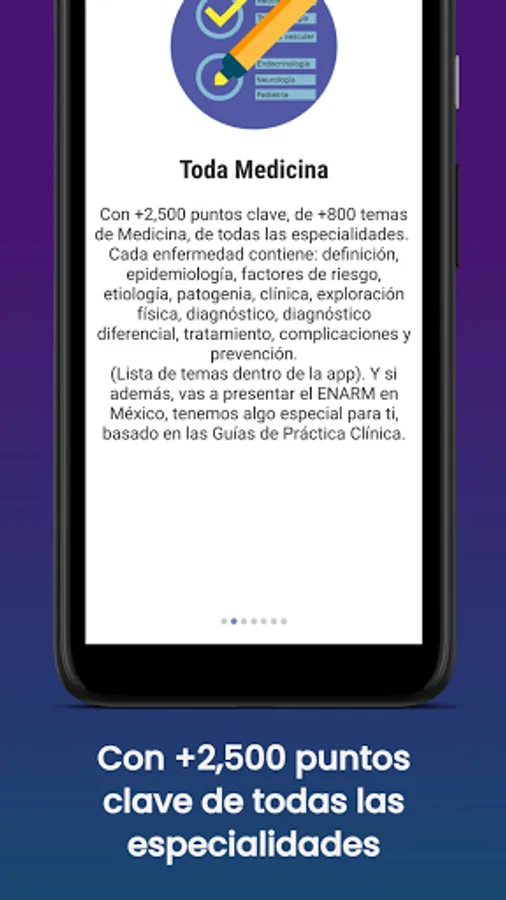 A) +2,500 key points of +900 subjects of all Medicine, and all specialties: Dermatology, Endocrinology, Rheumatology, Pulmonology, Cardiology, Infectology, Surgery, Neurosurgery, Vascular Surgery, Internal Medicine, Traumatology, Anesthesiology, Gastroenterology, Pediatrics, Gynecology, and more (for a complete list visit: https://memodiapp.com/list-of-themes). The topics are divided into 3 parts: 1) Definition, epidemiology, causes and pathogenesis, 2) Clinical and diagnostic, 3) Treatment, prevention / screening, complications.