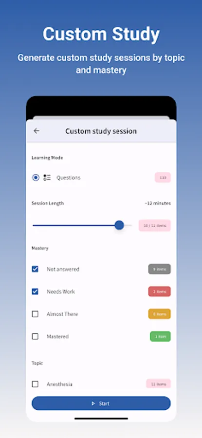 Custom Study Session - Generate custom study sessions by topic and mastery