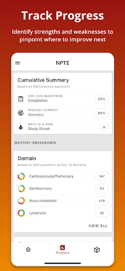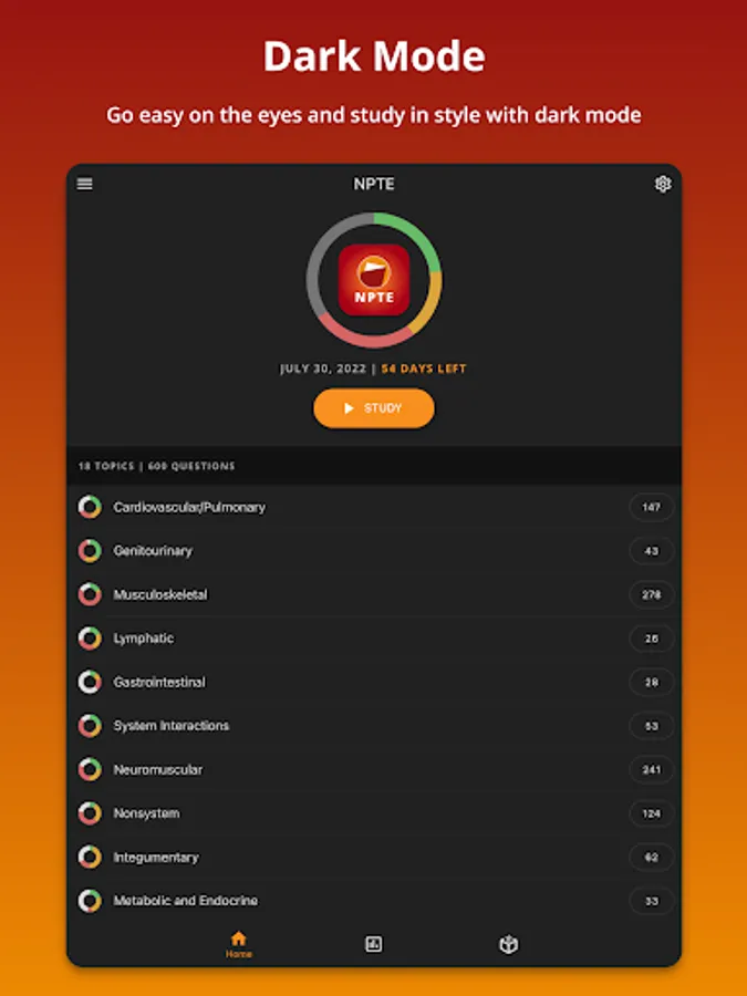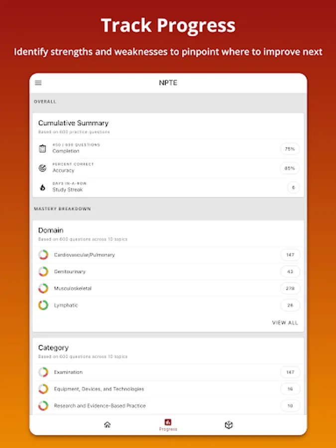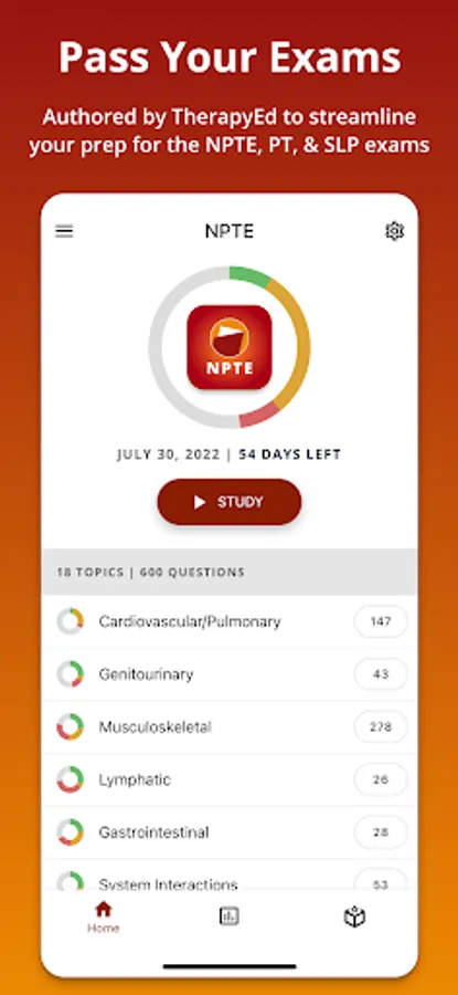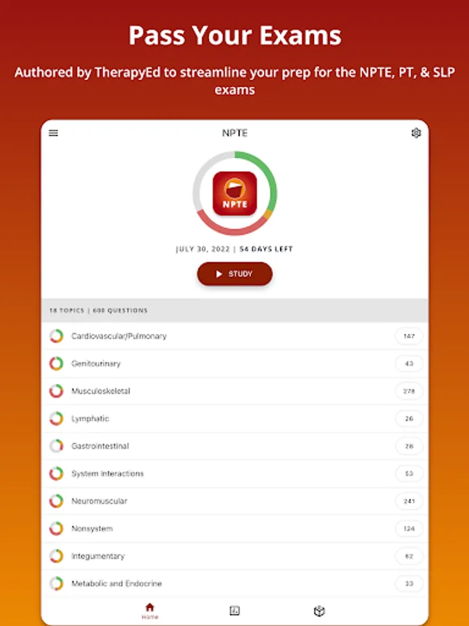 The TherapyEd Mobile App is your best streamlined mobile companion to help you pass your NPTE-PT, NPTE-PTA, and SLP PRAXIS exams. Each Study-Pack contains hundreds of comprehensive practice questions with detailed explanations integrated to the TherapyEd review & study guides. You can generate custom study sessions based on your mastery and filter by core domains, categories, and reasoning strategies. Additionally, you can track your progress and know where to improve next in real-time as you answer questions.