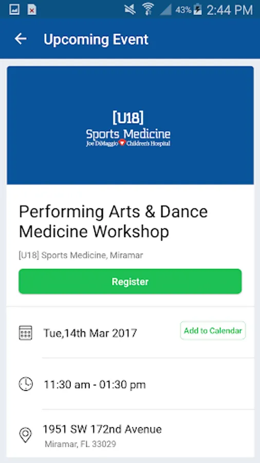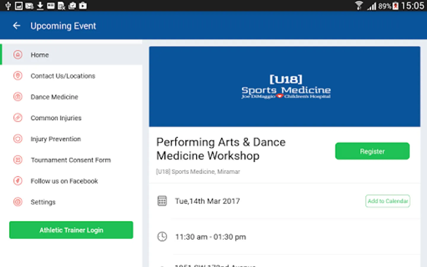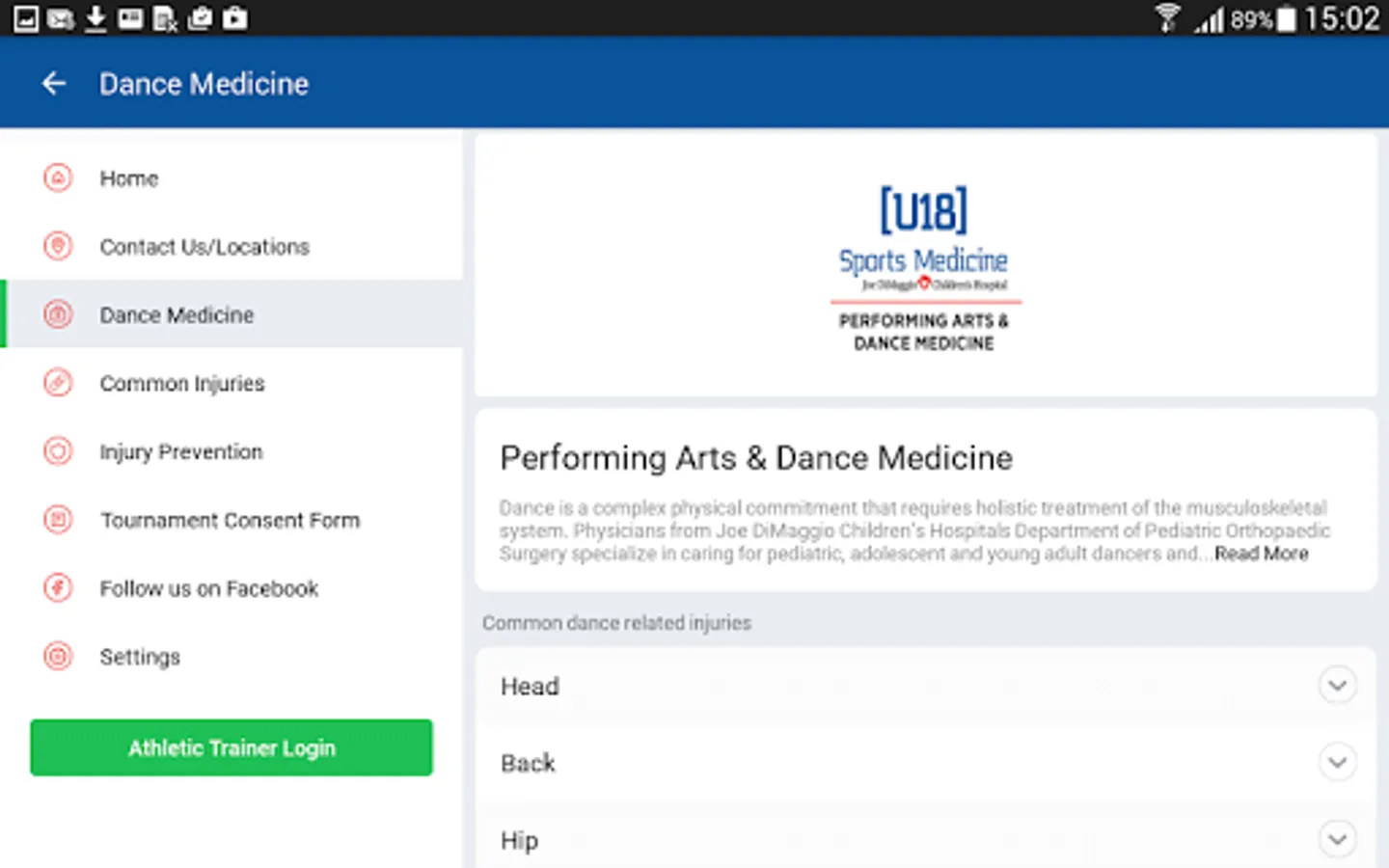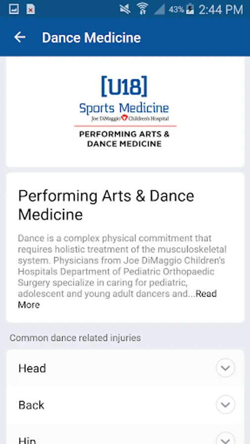 The [U18] Sports Medicine App offers quick access to professional, community and educational services and materials associated with the Joe DiMaggio Children’s Hospital pediatric orthopedic, sports medicine, physical therapy, dance medicine and concussion programs.