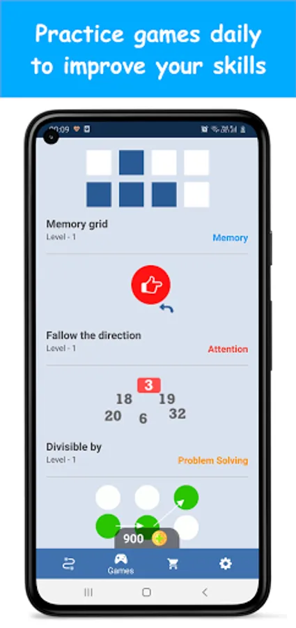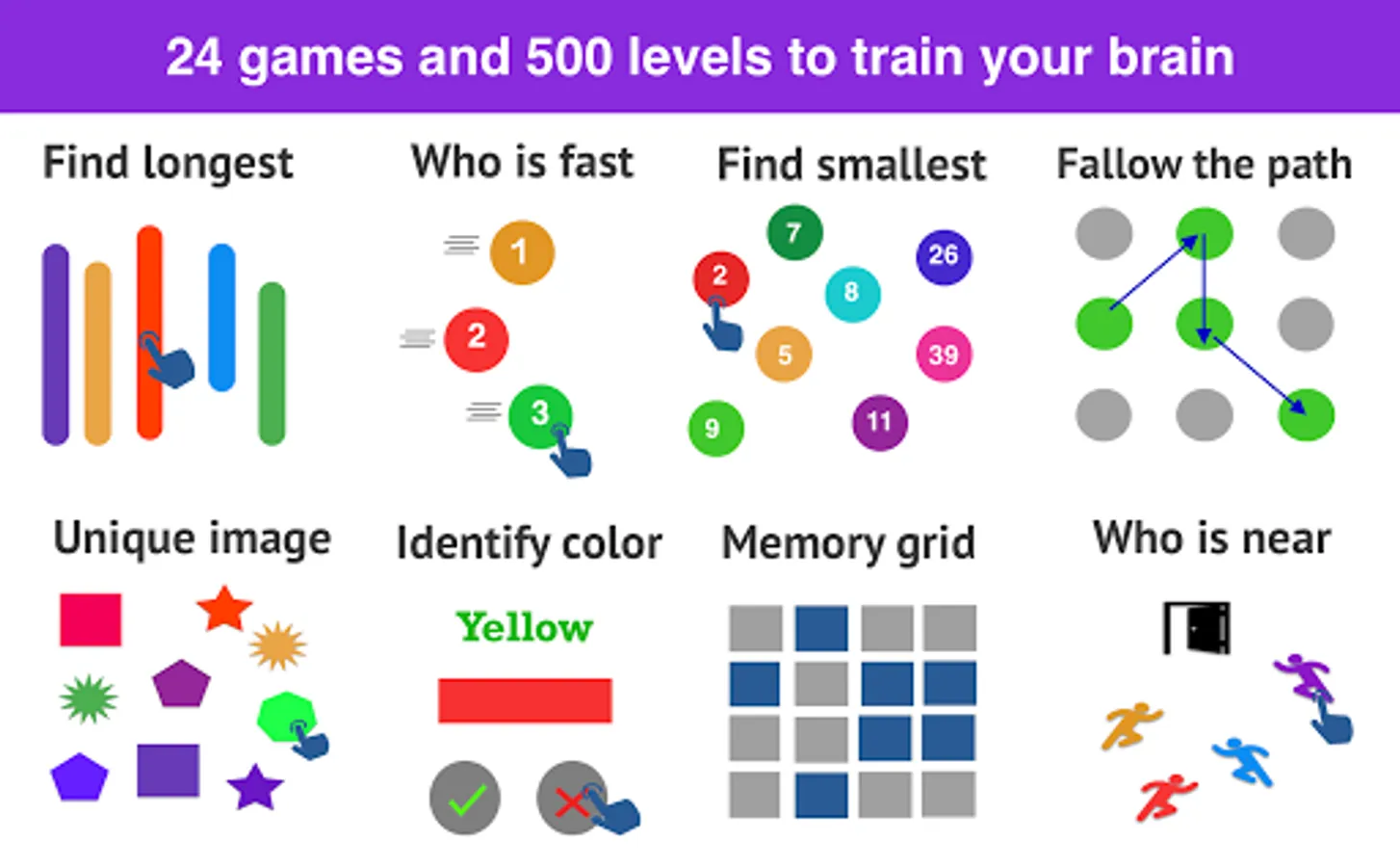 While playing brain games, you will get a lot of fun and gradually improve your brainpower, memory, concentration, attention, and accuracy skills 💪. Each game helps to test your brain;