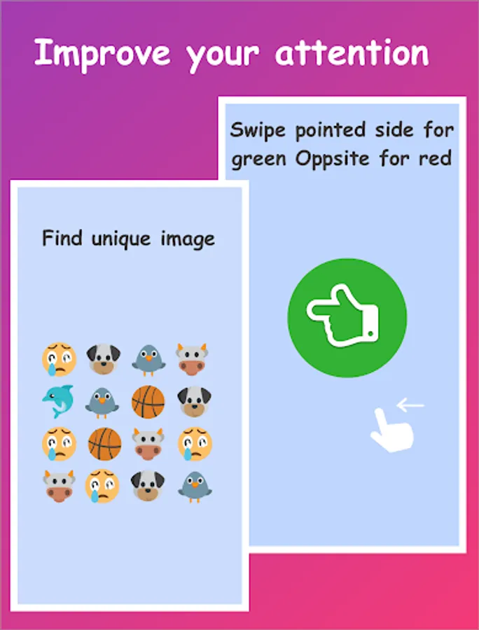 Attention Games: Swipe left-right based on given directions to improve right-left brain memory, pay attention to the colors, images, and numbers. Each attention game makes you more focused on increases your mind power and concentration levels of speed reading and attention training.