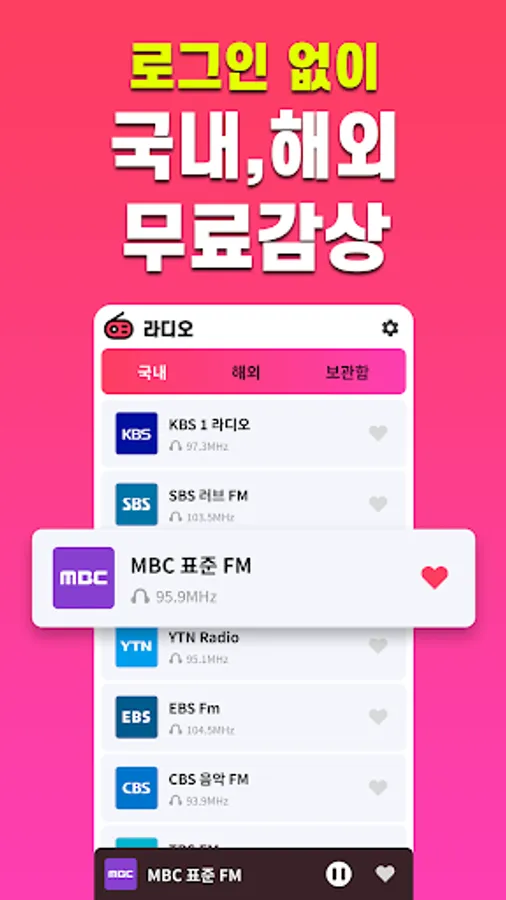 - Domestic: KBS 1 Radio, KBS 2 Radio Happy FM, KBS 3 Radio, KBS Classic FM, KBS Cool FM, KBS Korean Broadcasting, KBS World CH1, KBS World CH2, KBS World Music, MBC Standard FM, MBC FM4U, SBS Power FM, SBS Love FM, FEBC Far East Broadcasting, BBS Buddhist Broadcasting, BTN Buddhist Broadcasting, CPBC Peace Broadcasting, WBS Original Sound Broadcasting, OBS Gyeongin FM, Gyeongin Broadcasting iFM, CBS Standard FM, CBS JOY4U, YTN News FM, EBS FM Radio, EBS Foreign Language Radio, TBS Traffic Broadcasting FM, Korean Traditional Music FM, National Defense FM, AFN FM, Arirang Radio, Community Radio, Gwangju English eFM, Busan English eFM, Radio Korea AM, Radio Seoul AM, RFA Free Asia Broadcasting, etc.