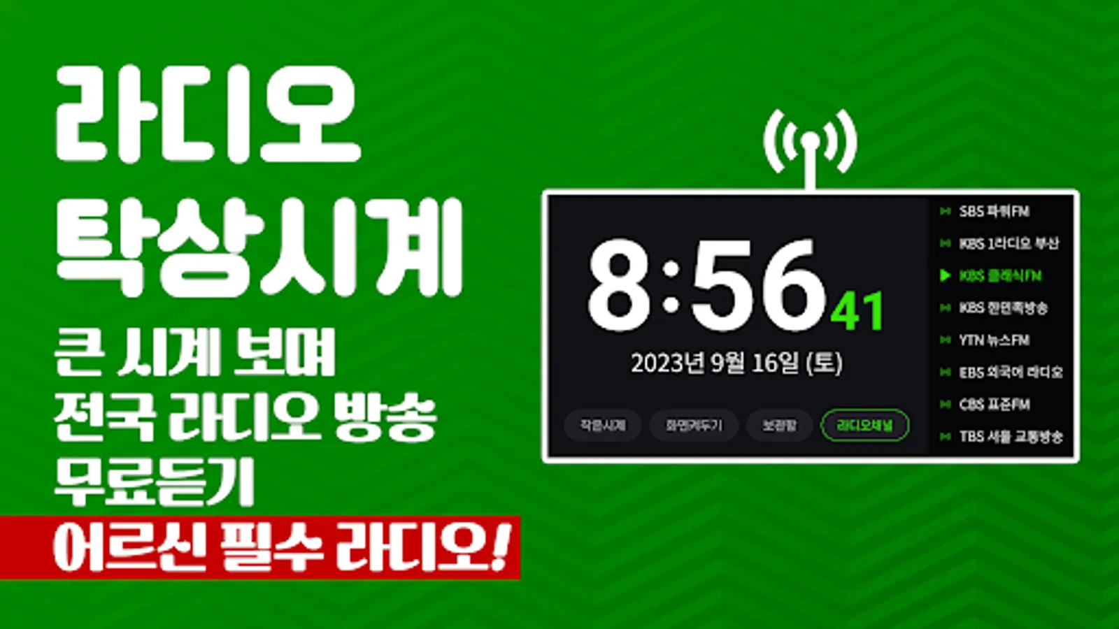 Enjoy the desk clock and radio functions all in one place. Students, test takers, those studying, office workers, and drivers can all use it usefully. You can use it as a desk clock on the large screen in landscape mode and change your mood by listening to music or the radio. It is a must-have app for exercising, walking, fishing, driving, and studying.